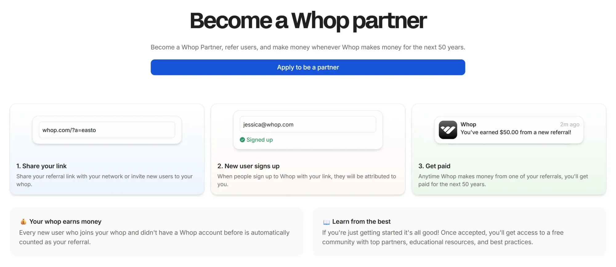 Whop's affiliate program lets you earn 30% (by default, can be changed by Whop creators) commission by sharing whops with others.