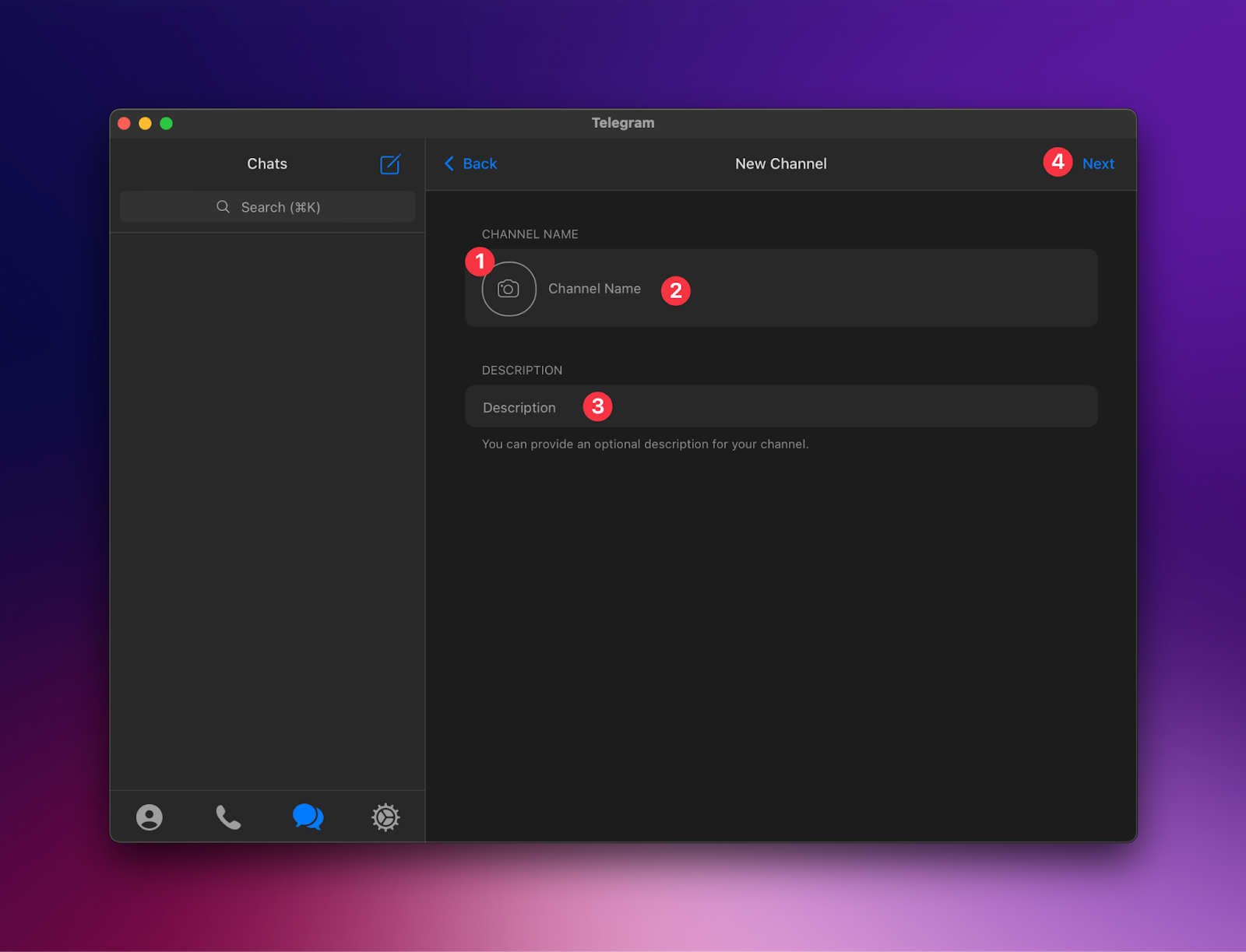 You should now see a page with the heading “New Channel.” On this page, you can give your channel an icon (1), a name (2), and a description (3).