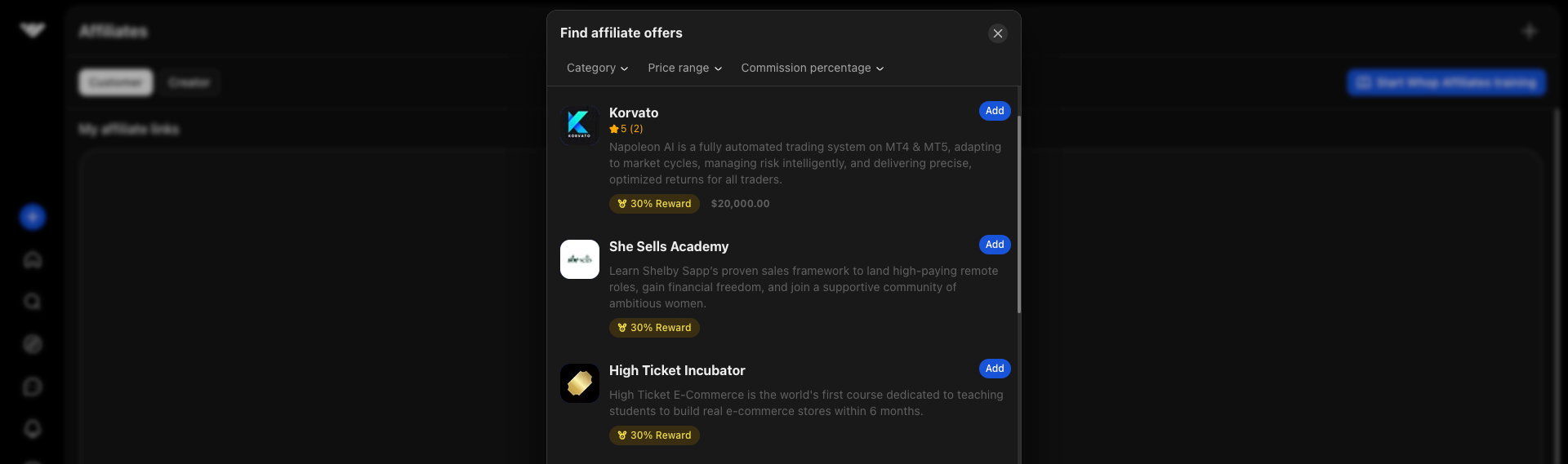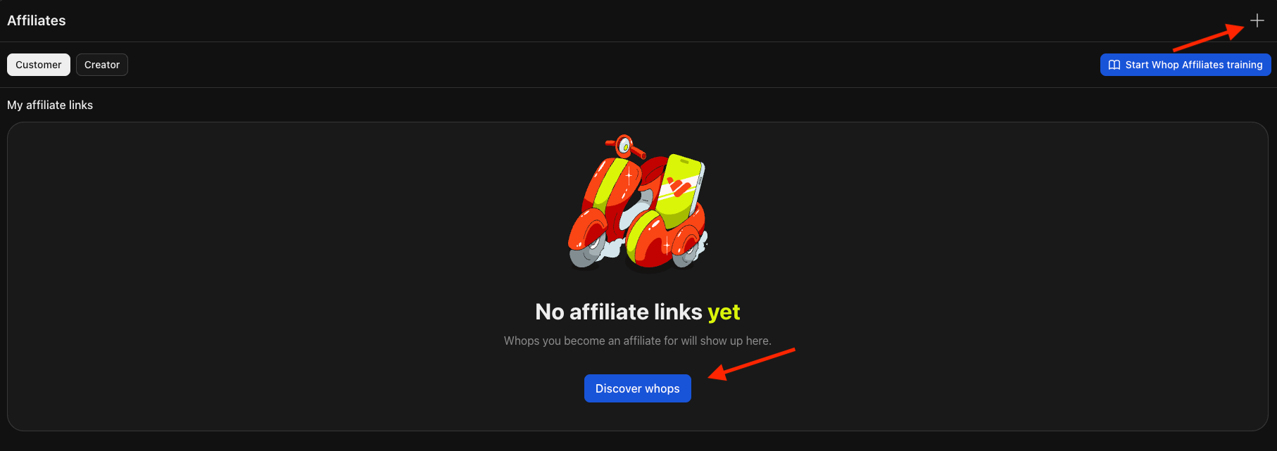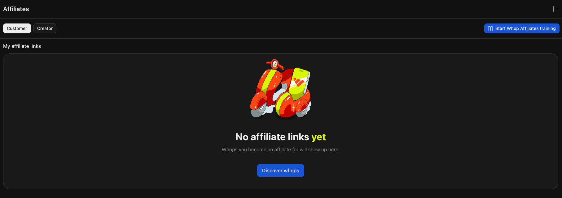 As you can see on the screenshot above, getting an affiliate link from these is as simple as clicking on the “+” icon on the top right, or on the “Discover whops” button.