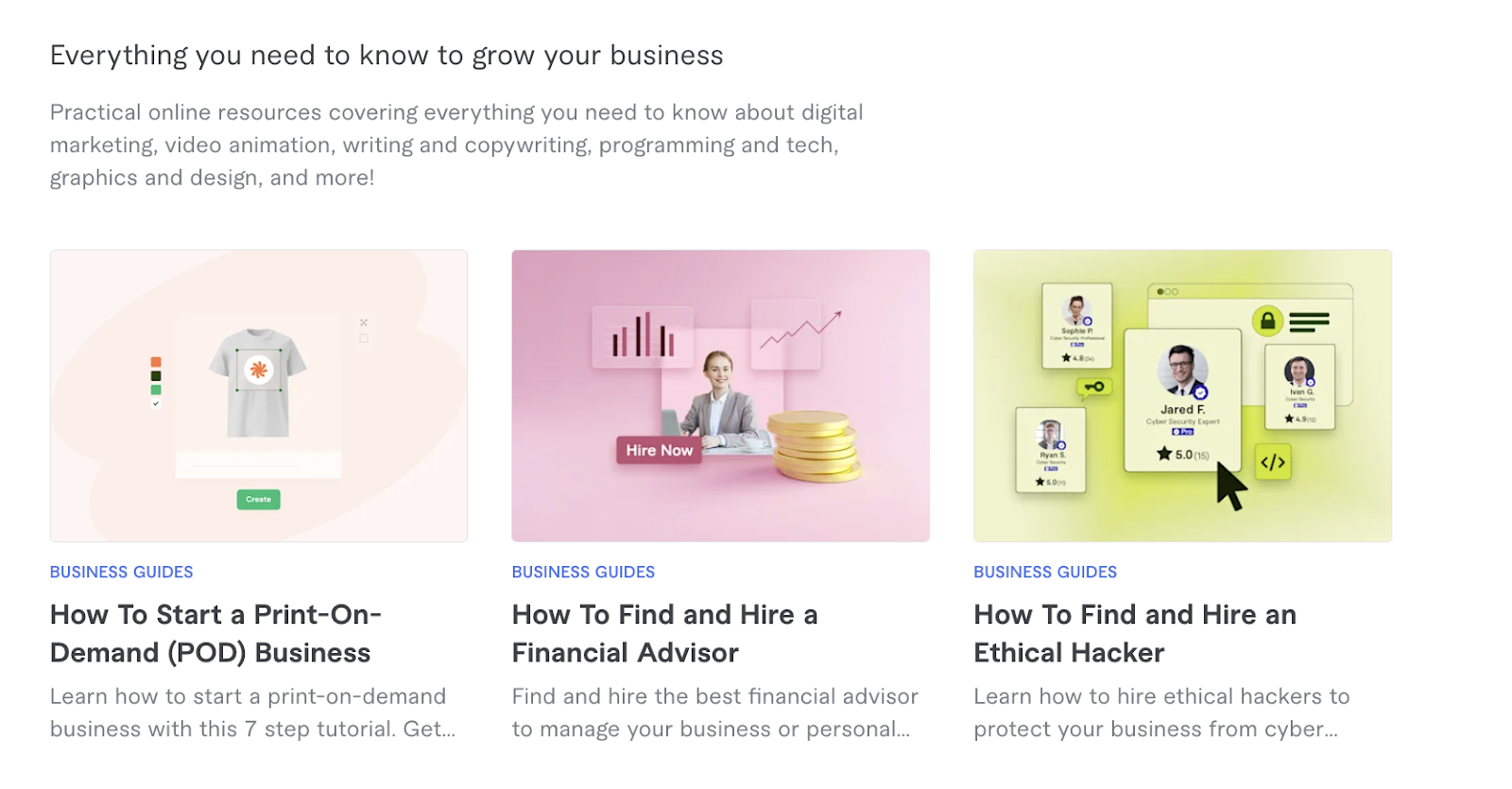 Fiverr offers a guide section, with insights on running and growing a business online.