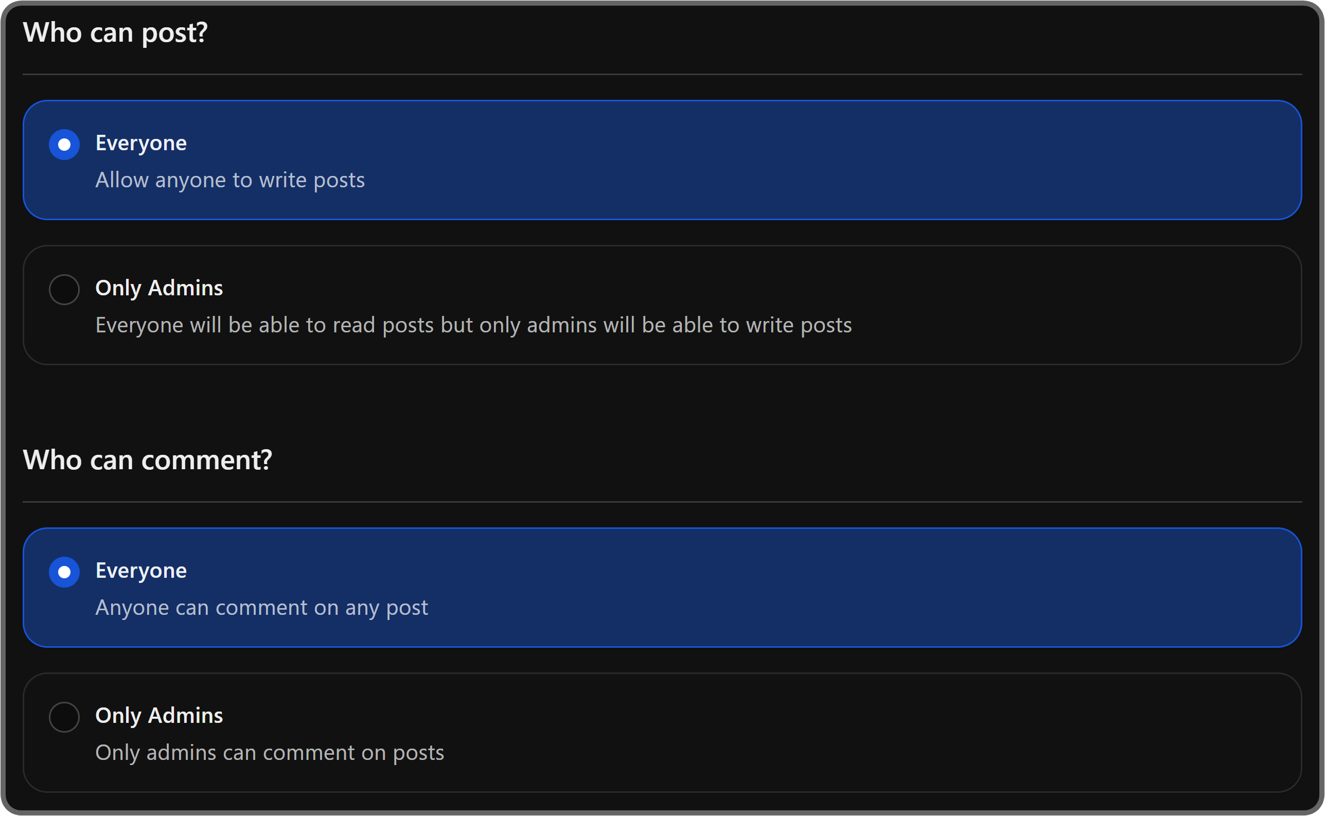 Moving on, we see the Who can post? and Who can comment? settings. Both have two options. Let's start with the Who can post? setting. It's options are: