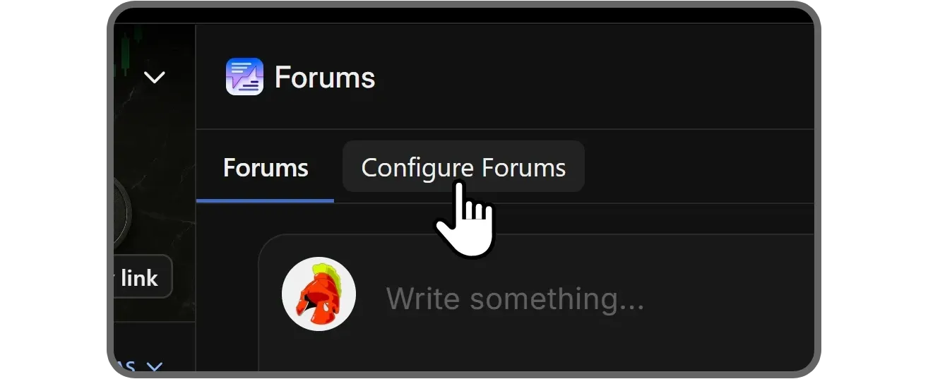 Some apps on Whop, like Forums and Chat, have settings additional to the regular app settings. To see the Forums app's configurations, click the Configure Forums button at the top of the app.