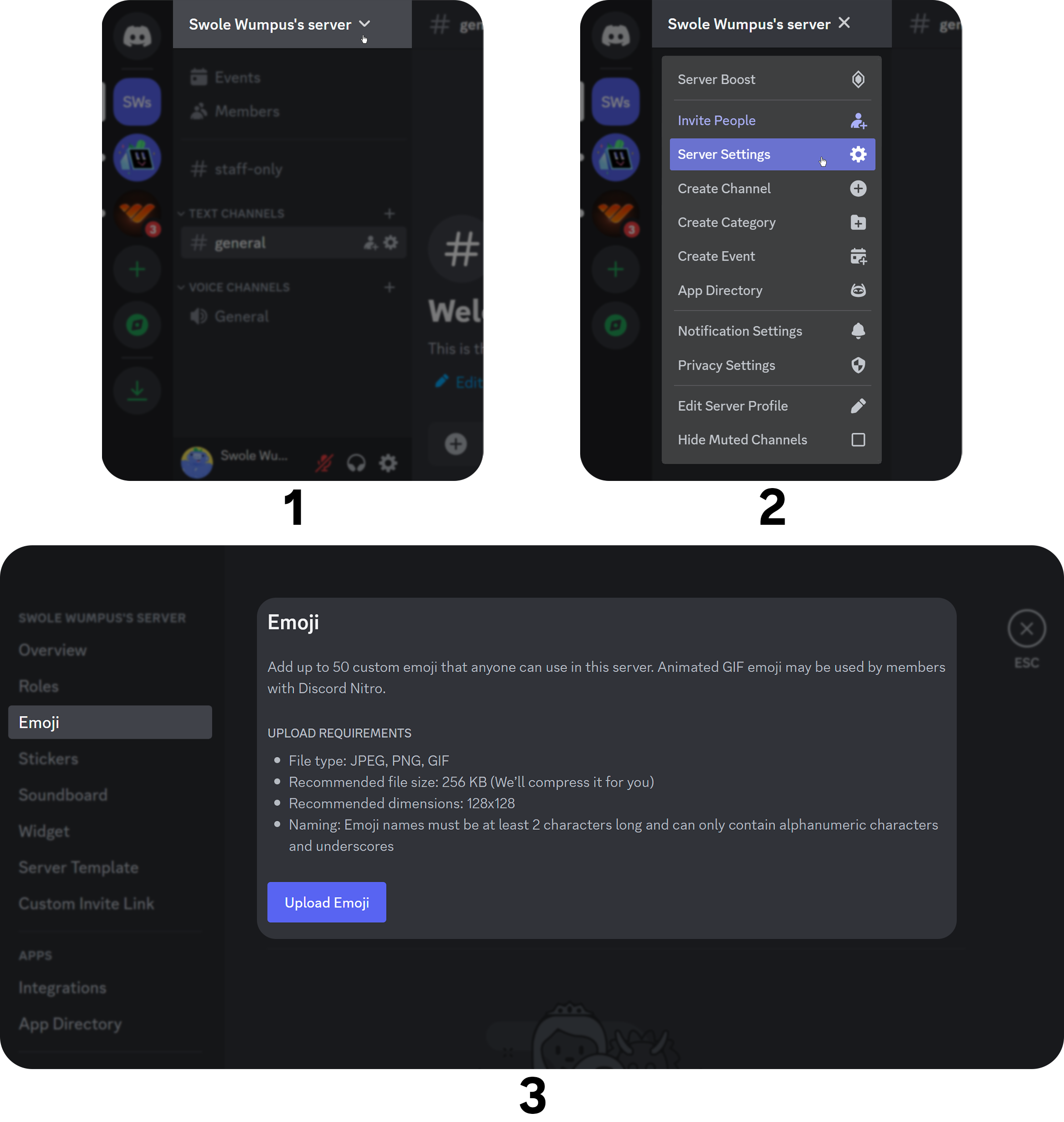 - Click "Upload Emoji" and choose your desired image files (the maximum size is 256KB). After uploading an emoji, make sure to change its name! The limit for both emojis and animated emojis is 50, and it increases by 50 with each Server Boost level.