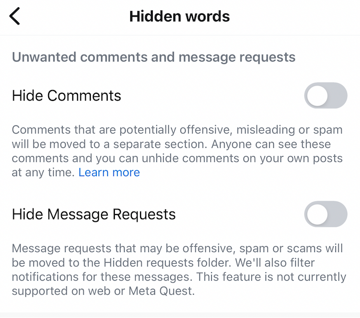 Go to "Settings and Privacy" > "Privacy" > "Hidden Words" and toggle on "Hide comments." You can also manually filter out specific words, phrases, or emojis by adding them under "Manage custom words and phrases."