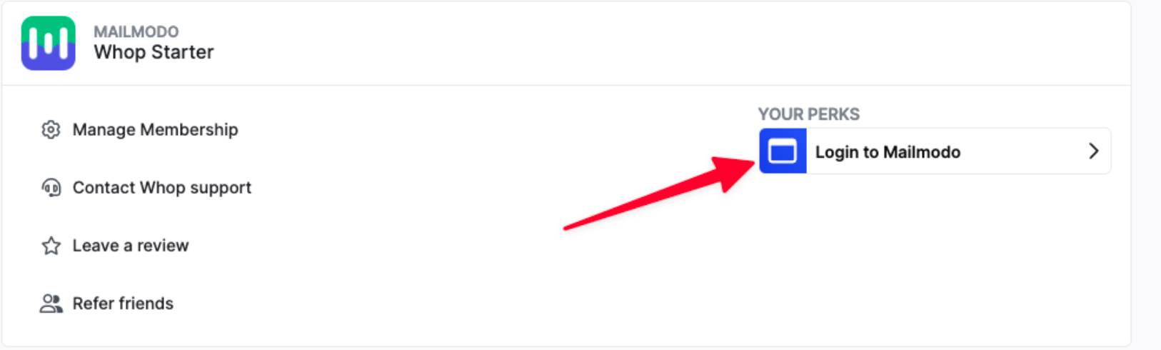 Now that you have purchased Mailmodo, go to your Whop Hub and select ”Login to Mailmodo”. This will redirect you to the Mailmodo site.