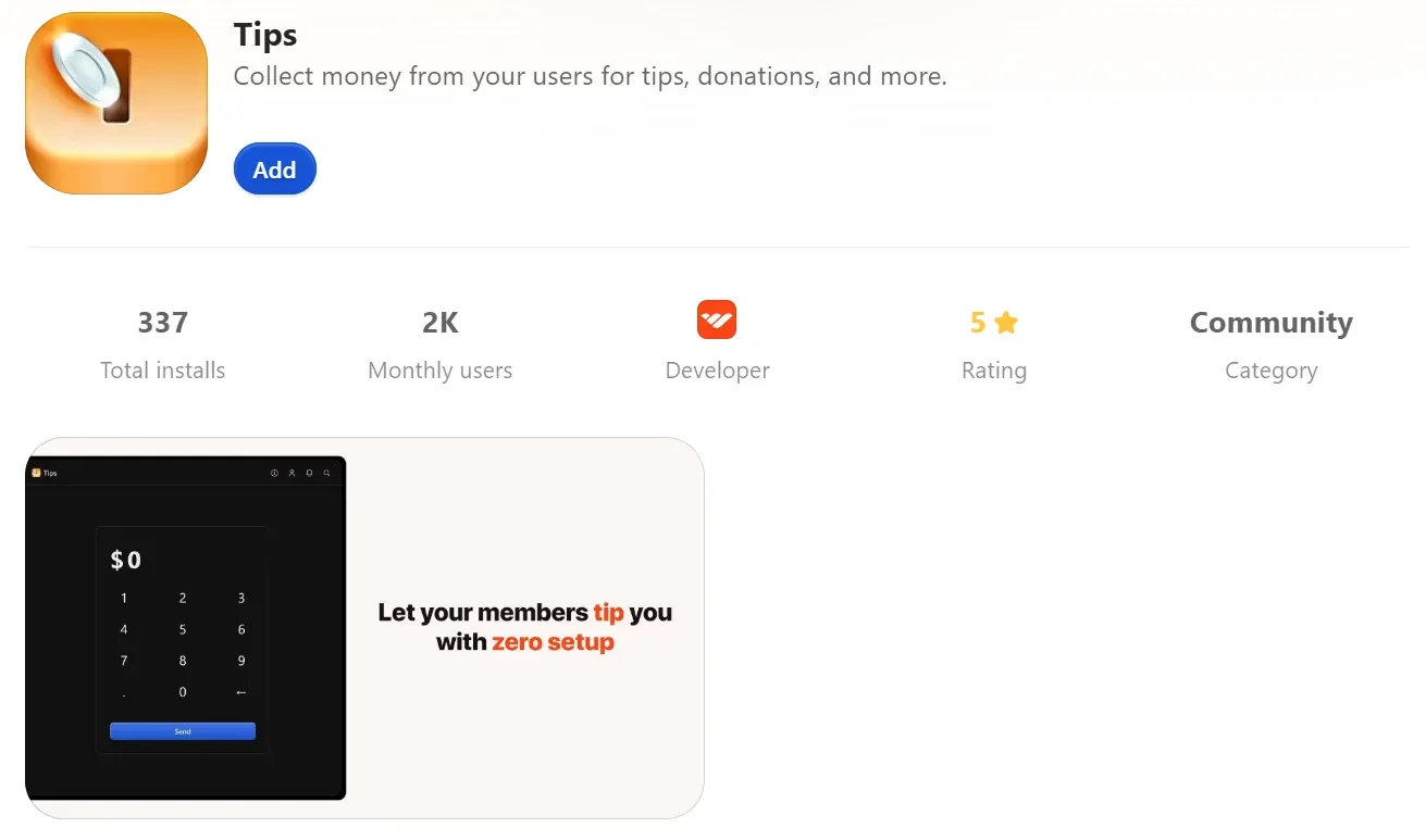 Using the ‘Tips’ app in your whop, you can accept monetary donations from your biggest fans. It is super easy to use and you don’t need to worry about signing up and managing external crowdfunding websites.