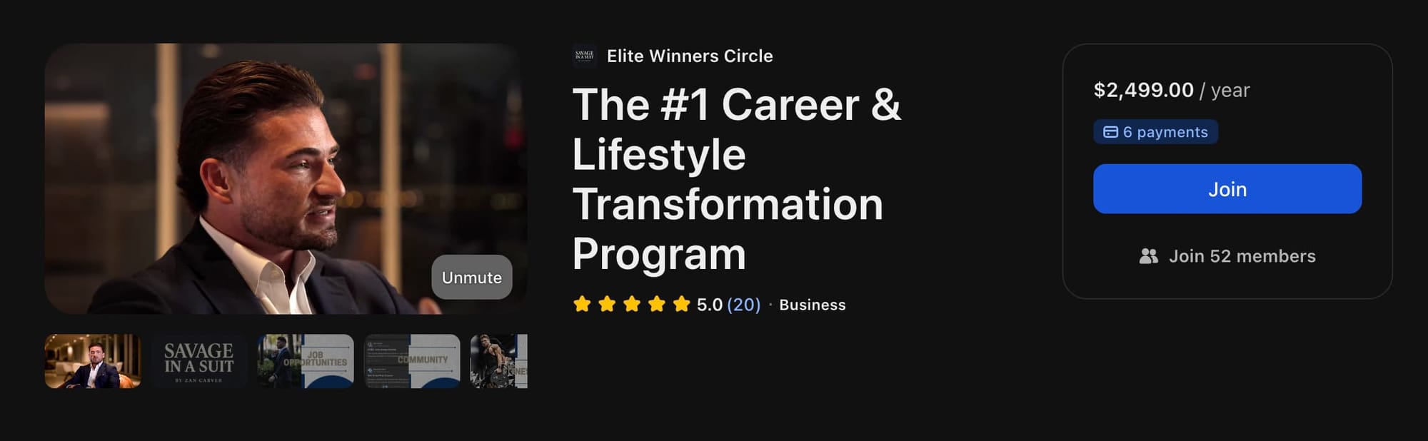 - Why the offer works: Zan has mastered the hybrid model, mixing mindset, confidence, and real-world connections into one offer. It’s aspirational, but still accessible.