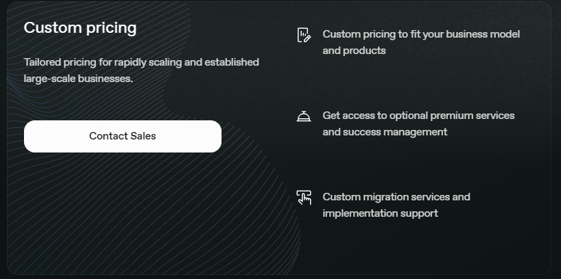 For companies processing high volume, selling lower-priced products, or needing invoicing and migration support, Paddle offers custom pricing tailored to your business model.