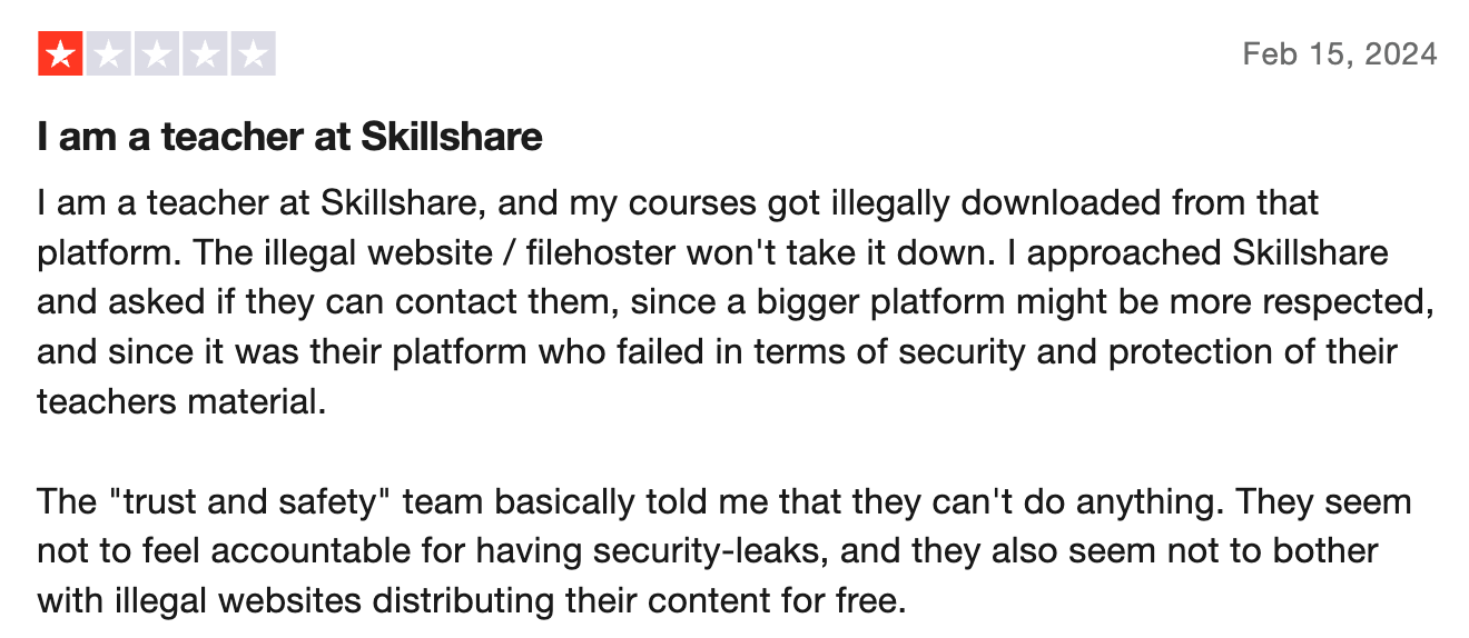 There are plenty of poor reviews from users who have signed up to Skillshare as learners, stating issues with unauthorized payments, poor communication, and poor quality of content.