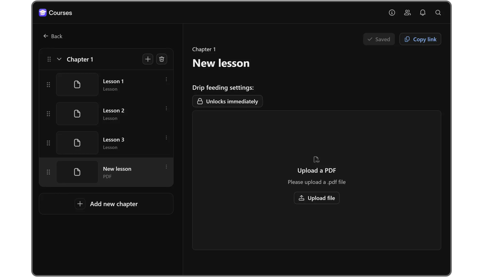 Just like adding a video file on the Video lessons, you can add a PDF file by clicking on the Upload file button.